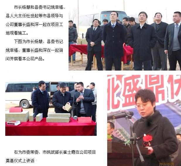 河北盛鼎保溫材料有限公司年產(chǎn)30萬(wàn)噸巖棉制品項(xiàng)目,自開(kāi)始運(yùn)籌,就得到了市、縣各級(jí)領(lǐng)導(dǎo),各有關(guān)部門(mén)的大力關(guān)懷和支持。市委常委崔士霞、市人大副主任吳平親臨項(xiàng)目奠基儀式。市委書(shū)記劉可為,市長(zhǎng)楊慧,市紀(jì)委書(shū)記魏存計(jì),市委常委、秘書(shū)長(zhǎng)王金剛,市人大副主任、黨組書(shū)記楊勝忠,副市長(zhǎng)馬福華等都曾親臨公司和公司項(xiàng)目工地視察。縣委書(shū)記姚幸福,縣長(zhǎng)石躍輝及縣“四大班子”其他主要領(lǐng)導(dǎo),也曾多次到公司和項(xiàng)目工地進(jìn)行指導(dǎo)并召集有關(guān)部門(mén)現(xiàn)場(chǎng)辦公。